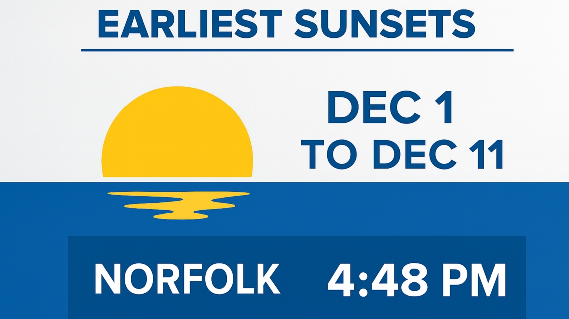 17+ hour, 21+ min ago (257+ words) If you've stepped outside lately, you've probably noticed the evenings feeling darker earlier... and that trend is about to reach its peak. Norfolk will experience its earliest sunsets of the year starting next week To stream 13News Now on your phone, you need the 13News Now app. Download the 13News Now app Next up in 5 Example video title will go here for this video Even though the winter solstice " the shortest day of the year " isn't until December 21, the earliest sunsets actually happen a little earlier. Our sunset times and the length of the day don't change at the same rate because of the tilt of the Earth and the way our planet's orbit speeds up and slows down through the year. So even though daylight continues shrinking until the solstice, the sunsets themselves bottom out a bit sooner. In Norfolk, that means…...